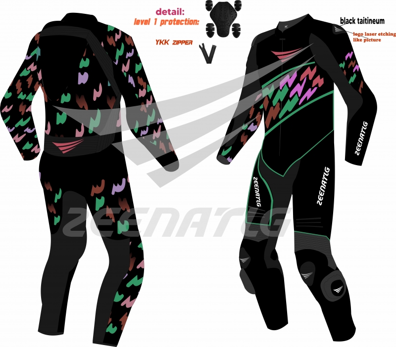 Top Grain Genuine Cowhide Mild leather 1.3-1.4mm Perforated (As per Design or on per customer’s desire) Sponsored Labels & Printings Stretch as per Design or on per Customer’s desire. Original YKK Zipper at Front, Cuffs & Calf External Shoulder, Elbow & Knee protections (As per Design or Customer’s desire) Dupont Kevlar or Scholar Keprotec Stretch Fabric at inner arms and Crotch and Back Shin Areas (As per design) Nylon Thread stitch